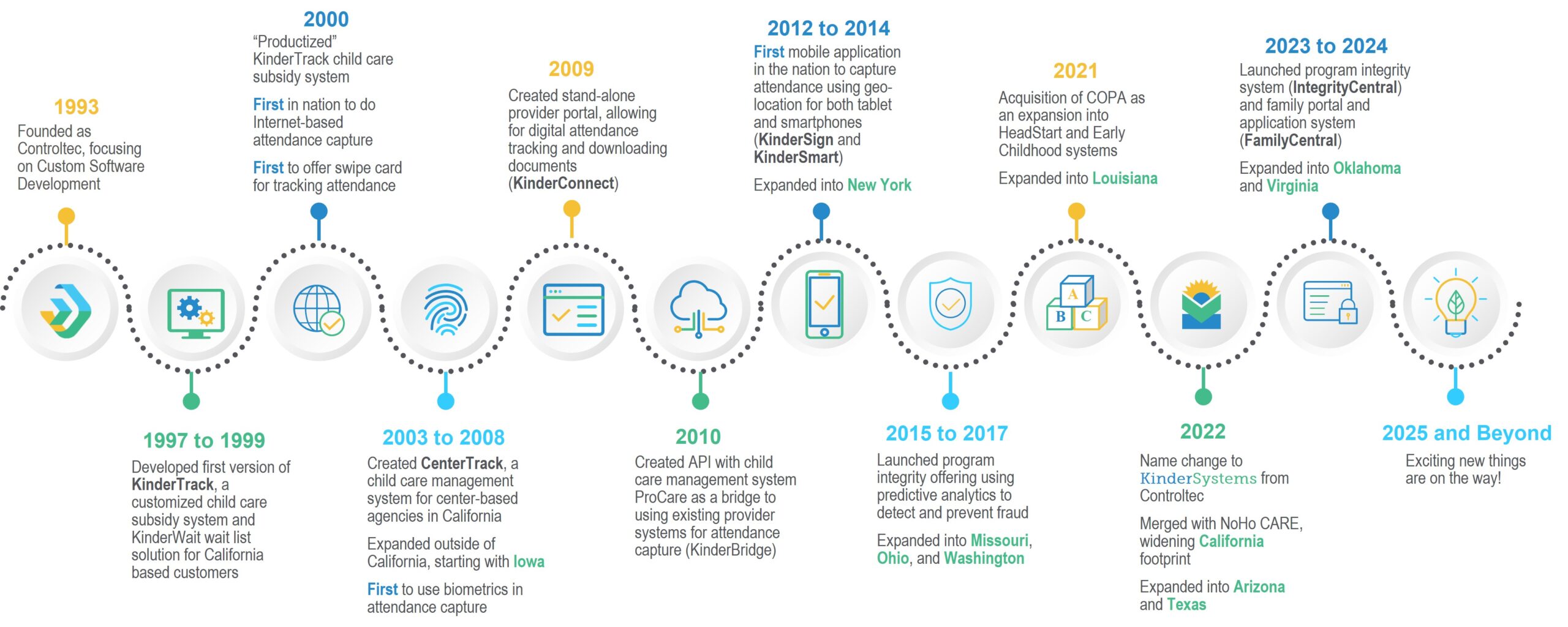 KinderSystems history is one of constant evolution and firsts — we were first to market using internet-based methods for time and attendance collection back in 2000 with what became our cornerstone subsidy management system products known today as partners as KinderTrack and KinderConnect. These concepts propelled us into being the market leader for system interconnectivity and streamlining manual processes.